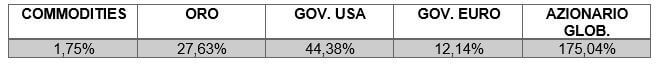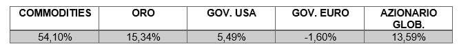 Guardando questo ultimo anno, oro e materie prime (commodities) sono andate meglio sia rispetto all’azionario globale che all’obbligazionario titoli di stato, sia americano che europeo.