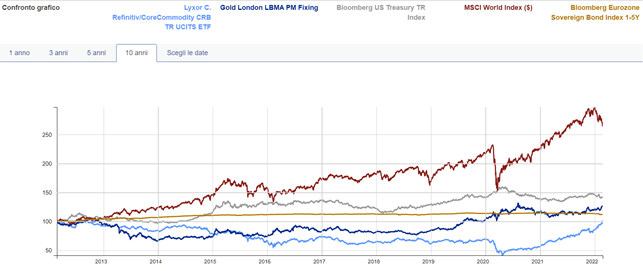Se spostiamo lo sguardo indietro di 10 anni , troviamo valori completamente diversi; Le materie prime offrono una performance dell' 1,75% , invece l'azionario offre il 175,04%.