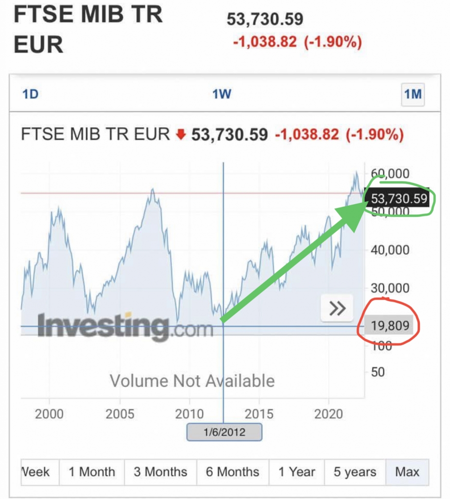 Come possiamo vedere dai numeri, l’indice Ftse mib dal 2012 ha toccato la vetta del 271% nonostante il recente calo.