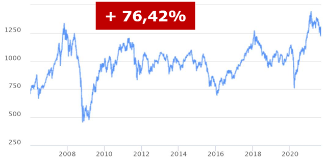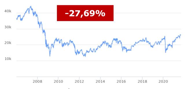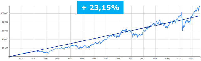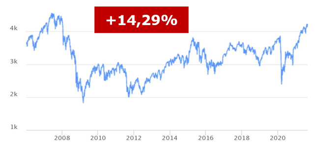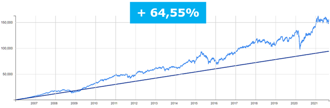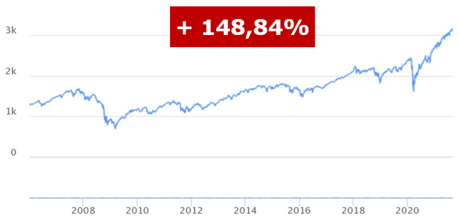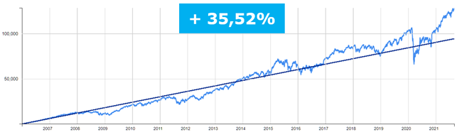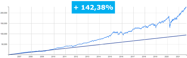 Il grafico relativo al piano di accumulo illustra in blu scuro la riga con il capitale investito (ipotesi di 500 euro/mese), in celeste il risultato. L’orizzonte temporale, infine, copre gli ultimi 15 anni abbondanti: dal 2006 al settembre 2021.